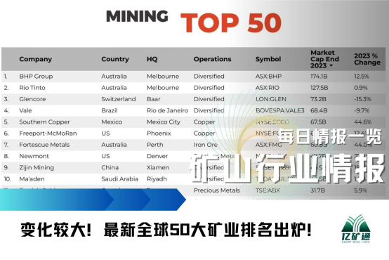 2023年底,Mining排出的全球最大50价矿企总市值达到1.42万亿美元,受到政府干预、镍锂价格暴跌、金价创历史新高、新的上市计划一触即发的影响,全球50大矿企市值排名发生了大的变化。